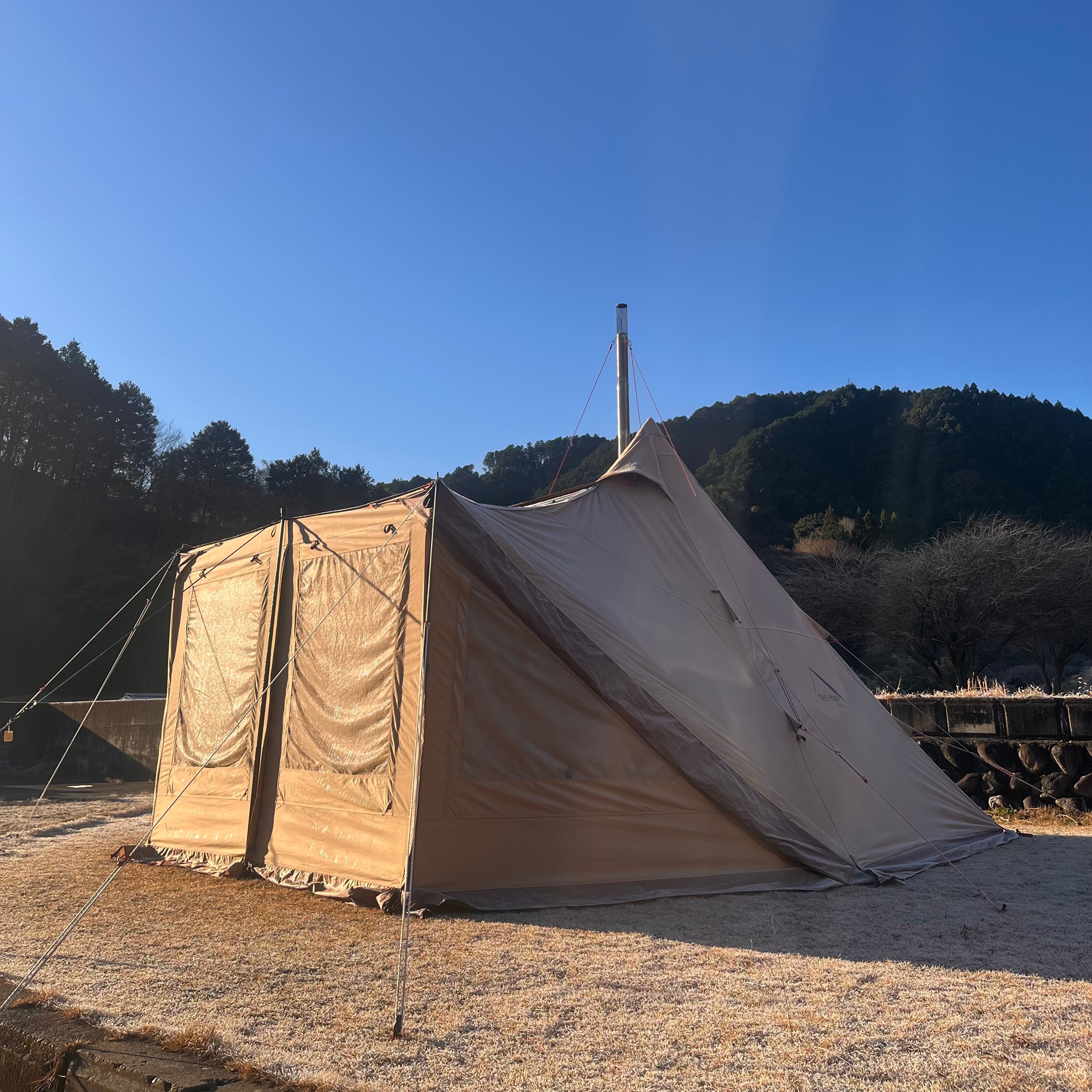 ・冬のお籠りキャンプ、トリポットをプラスしてデュオでも薪ストーブインが楽しめます。